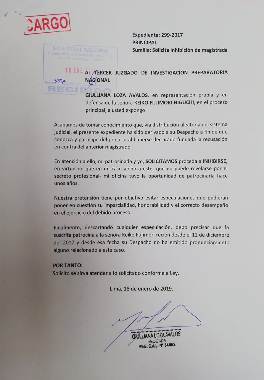 Además, Giulliana Loza aclara que la "pretensión tiene por objetivo evitar especulaciones que pudieran poner en cuestión su imparcialidad, honorabilidad y el correcto desempeño en el ejercicio del debido proceso".