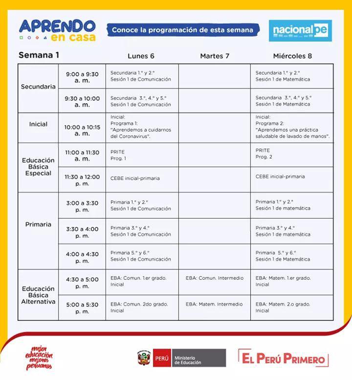 Los horarios de emisión a diario de los programas de “Aprendo en casa”, mecanismo del Ministerio de Educación (Minedu) para garantizar la continuidad escolar interrumpida debido al coronavirus, vía la señal de TV Perú, son: