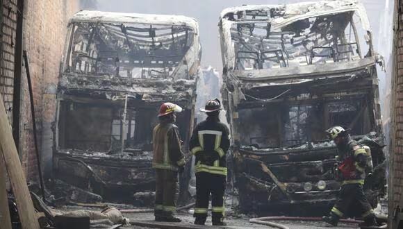 Cinco buses interprovinciales de dos pisos, dos retroexcavadoras y dos automóviles quedaron calcinados en un incendio de gran magnitud en un taller-cochera, en Ate.