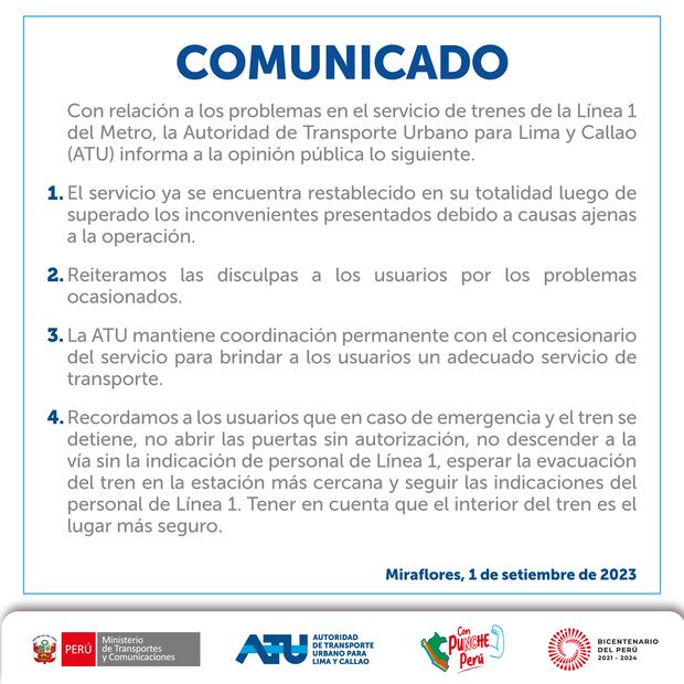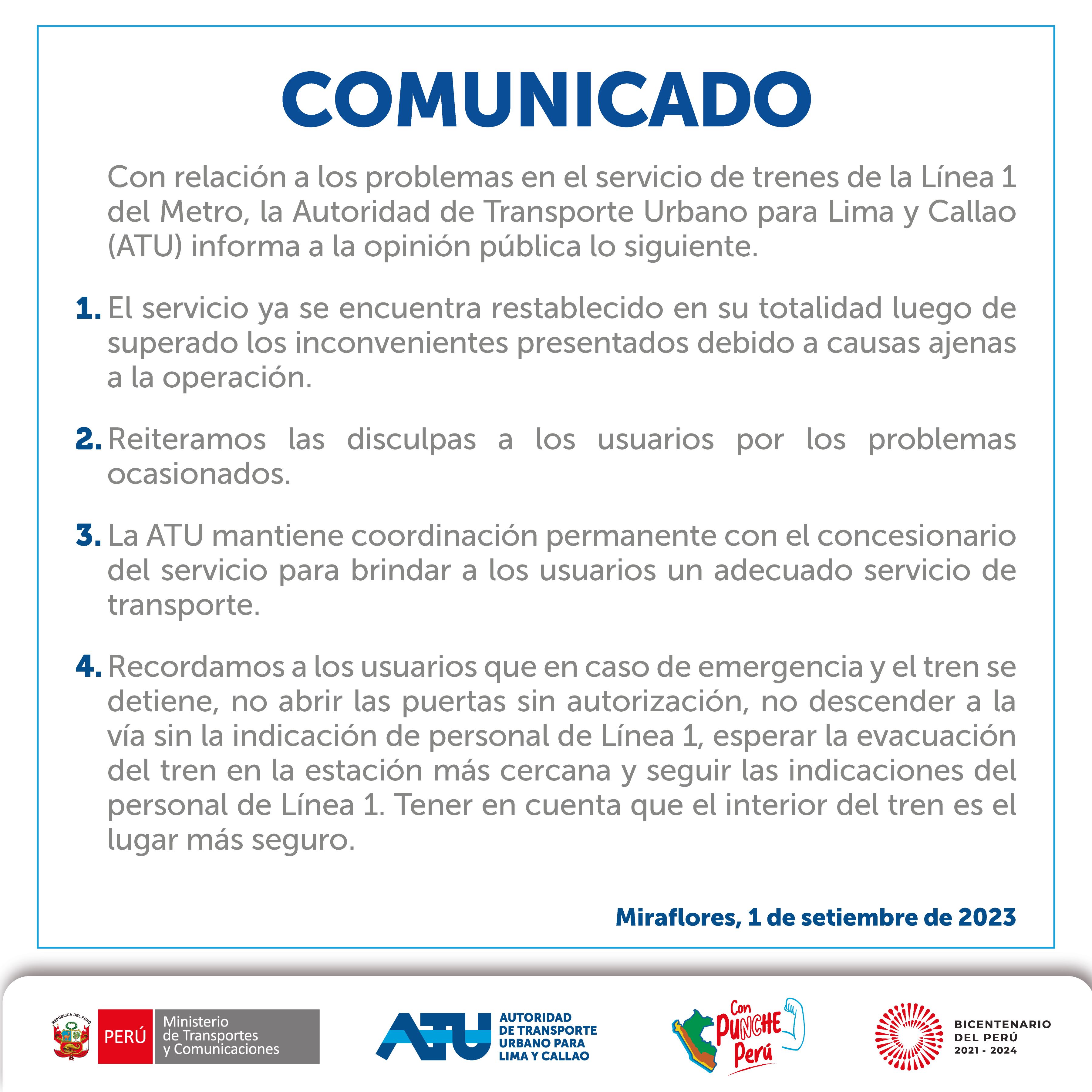 El comunicado de la Autoridad de Transporte Urbano para Lima y Callao (ATU) anunció la reanudación del servicio de la Línea 1 del Metro de Lima, después de que se registraran problemas técnicos en algunas de sus estaciones.