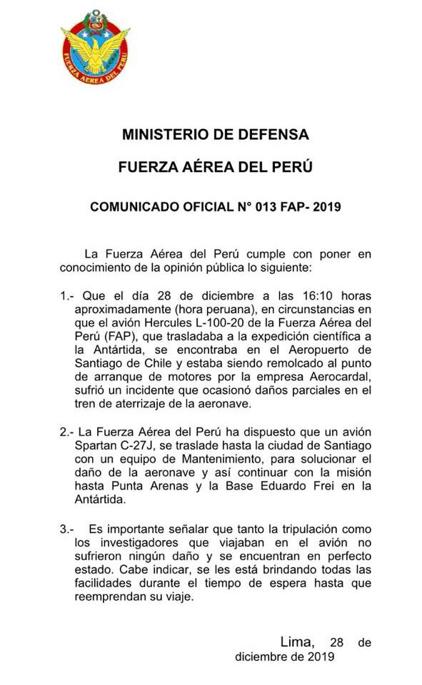 La Fuerza Aérea del Perú (FAP) informó que el avión Hercules L-100-20, que partió esta mañana desde Lima a Santiago de Chile, sufrió un incidente en el Aeropuerto de Santiago de Chile antes de partir a la expedición científica en la Antártida.