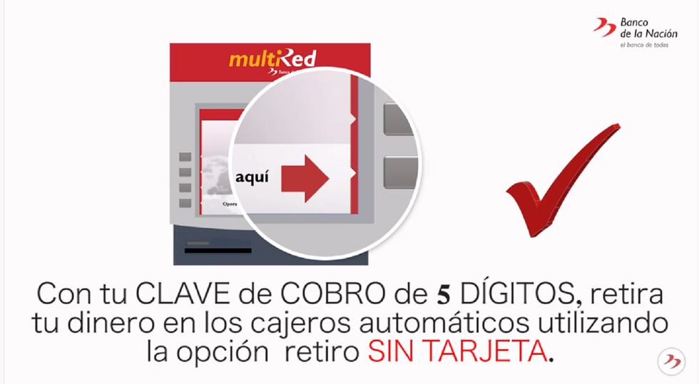 - O puedes retirar tu dinero usando tu clave de cobro de 5 dígitos en el Agente Multired de la Banco de la Nación más cercano a tu casa
