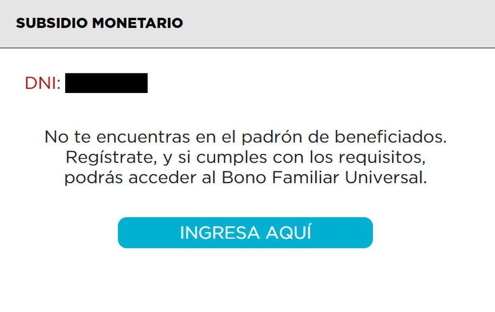 - Ningún integrante del hogar tenga un ingreso superior a los 3,000 soles mensuales, de acuerdo con la información disponible de la Superintendencia de Banca, Seguros y AFP (SBS) y de Sunat.