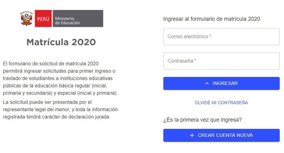 El ingreso a dicho enlace una vez que sea remitido activará el usuario y podrás acceder a la plataforma Matrícula 2020 para proceder con el registro de la solicitud. Tras completar una ficha de matrícula modificada para el año 2020, se generará una constancia de registro de solicitud, la cual se envía automáticamente al correo electrónico declarado y que también puede descargarse.