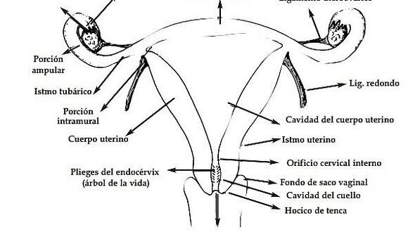 - El útero mide aproximadamente 8 cm de largo y 5 cm de ancho