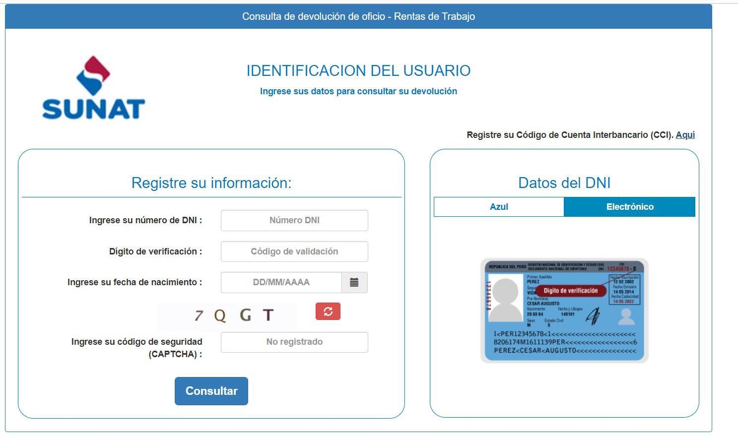 Para facilitar el proceso de registro del CCI y concretar el reembolso, la Sunat habilitó en su página web un módulo de consulta virtual sobre la devolución de oficio, donde las personas con rentas de trabajo de quinta categoría pueden verificar si tienen un abono pendiente y, además, registrar su CCI para que este reembolso sea depositado en su cuenta.