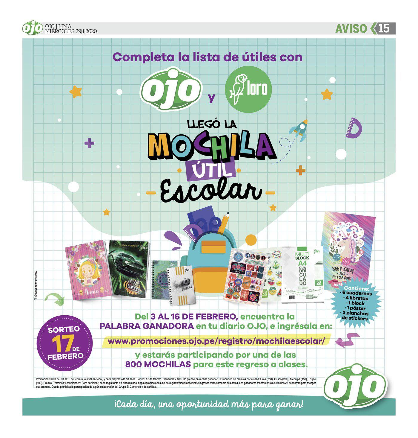 Busque dentro de su diario “Ojo” la palabra del día. Cuando la encuentre, ingrese al sitio web https://promociones.ojo.pe/registro/mochilaescolar/ y coloque sus datos junto a la palabra hallada en el periódico. Después de cumplir con estos pasos, ya estará registrado.