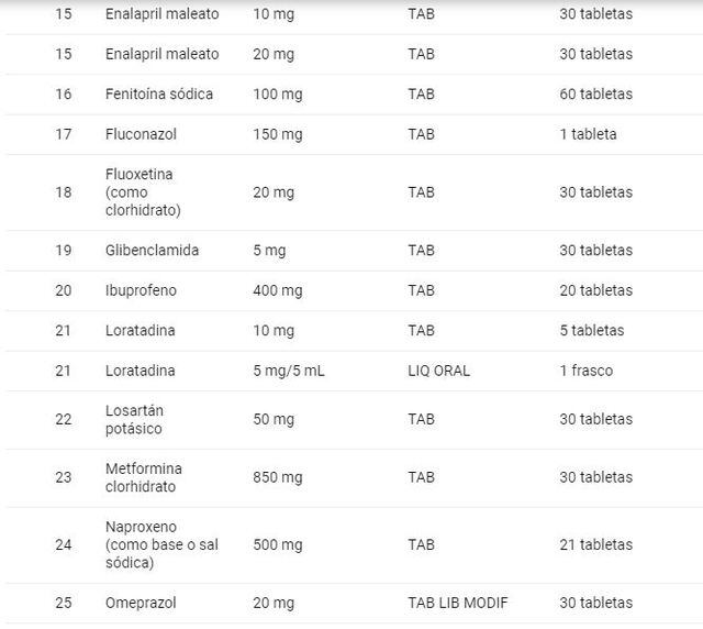 Entre ellos se encuentran la Amitriptilina, Amoxicilina, Azitromicina, Clonazepam, Enalaptril, Fluconazol, Ibuprofeno, Loratadina, Naproxeno, Paracetamol, Prednisona y Omeprazol.