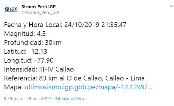 Según el Instituto Geofísico del Perú (IGP), el temblor tuvo una intensidad de 4.5 y estuvo ubicado a 83 kilómetros al oeste del Callao.