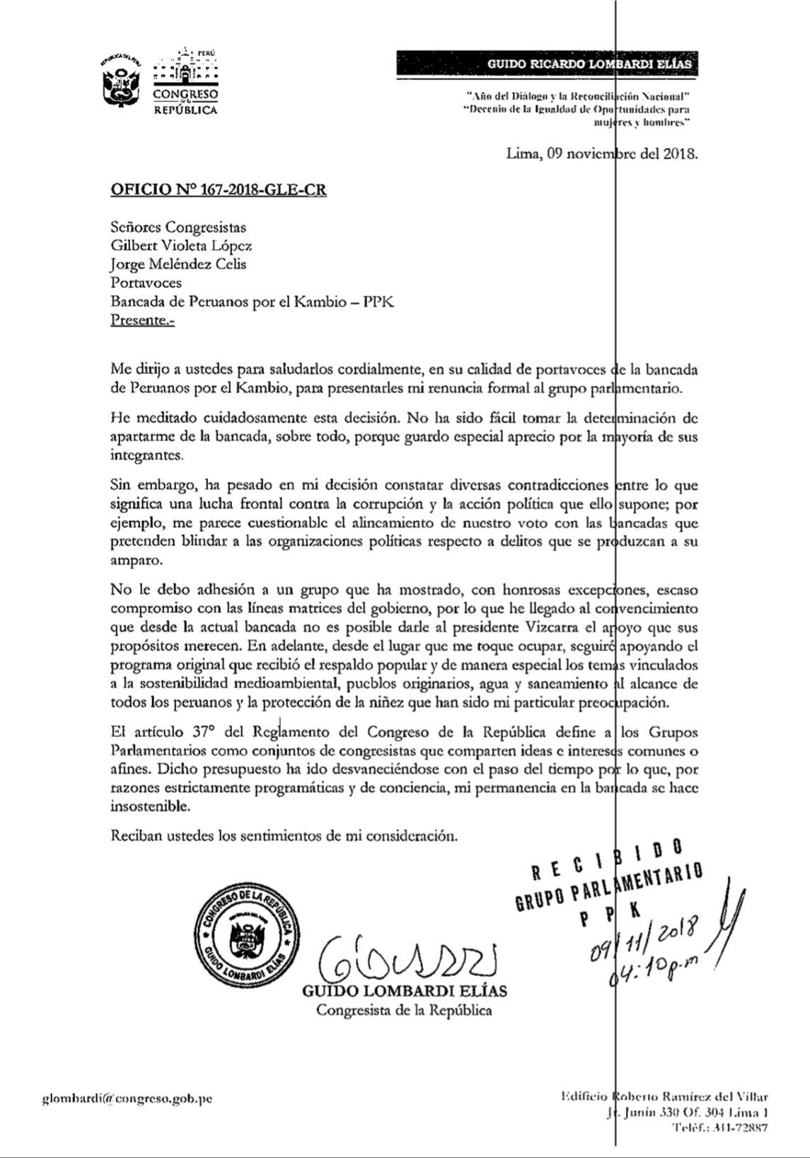 El documento señala que Guido Lombardi renuncia formente al partido político Peruanos por el Kambio ya que le parece "cuestionable blindar a las organizaciones políticas respecto a delitos que se reproduzcan a su amparo".