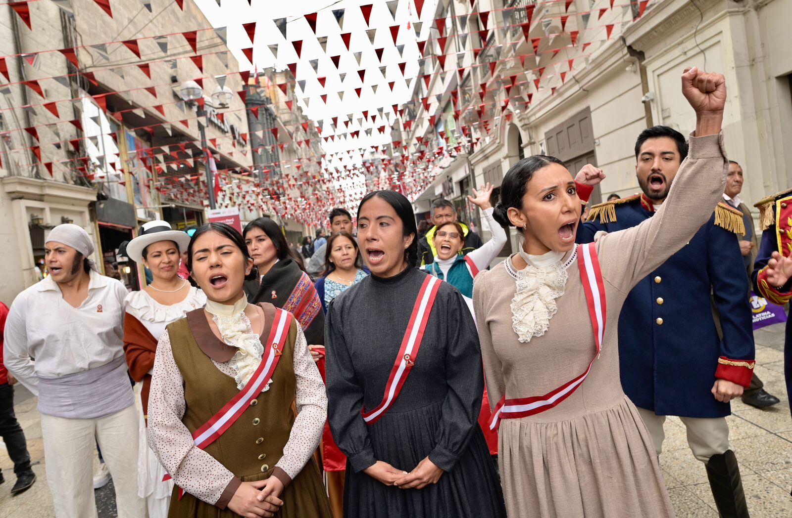 Con ocasión de fiestas patrias, figuras emblemáticas del Perú como José de San Martín, Simón Bolívar, Micaela Bastidas, María Parado y José Olaya, entre otros, recorrieron las calles del Centro Histórico de Lima para invitar a la ciudadanía a vivir esta fecha especial con un renovado patriotismo en el año en que se conmemora el bicentenario de la consolidación de la independencia y de las batallas de Junín y Ayacucho.