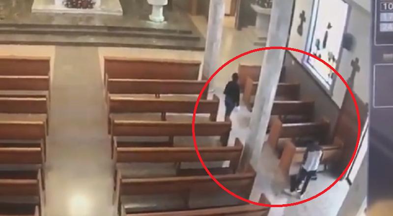 Como se puede ver en las imágenes, luego de recorrer el templo y hasta hacer reverencia frente a las imágenes religiosas; disimuladamente los jóvenes se acercan al depósito de las limosnas.