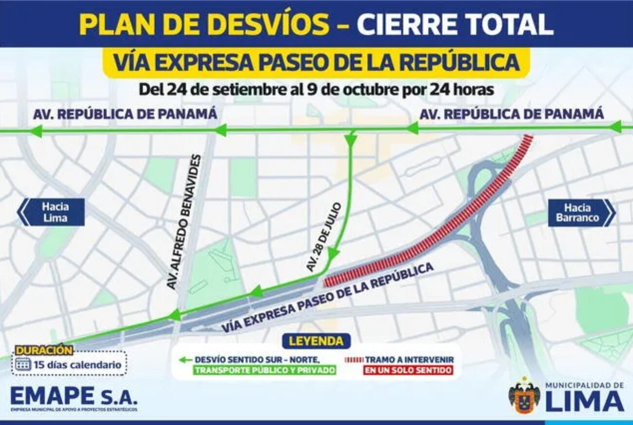 Con apenas un día de anticipación, la Empresa Municipal de Apoyo a Proyectos Estratégicos (Emape), de la Municipalidad de Lima, anunció que, a fin de remodelar los 9 kilómetros de la Vía Expresa Paseo de la República, cerrará tramos de la misma, lo que concretó ayer entre las avenidas República de Panamá, en Barranco, y 28 de Julio, en Miraflores, de sur a norte.