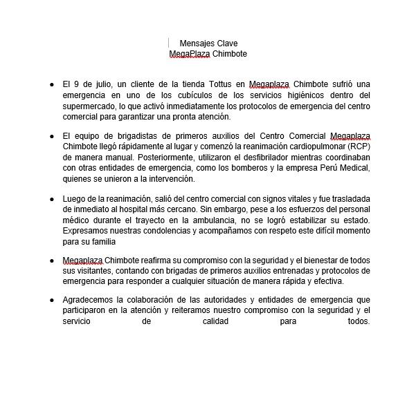 Mediante un comunicado, MegaPlaza Chimbote informó que el 9 de julio un cliente sufrió una emergencia médica dentro de los servicios higiénicos de la tienda Tottus, lo que activó inmediatamente sus protocolos de emergencia.