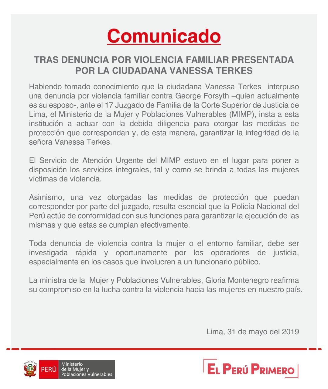 El Ministerio de la Mujer se pronunció con un comunicado en Twitter por la denuncia de violencia familiar presentada por Vanessa Terkes al alcalde de La Victoria, George Forsyth.