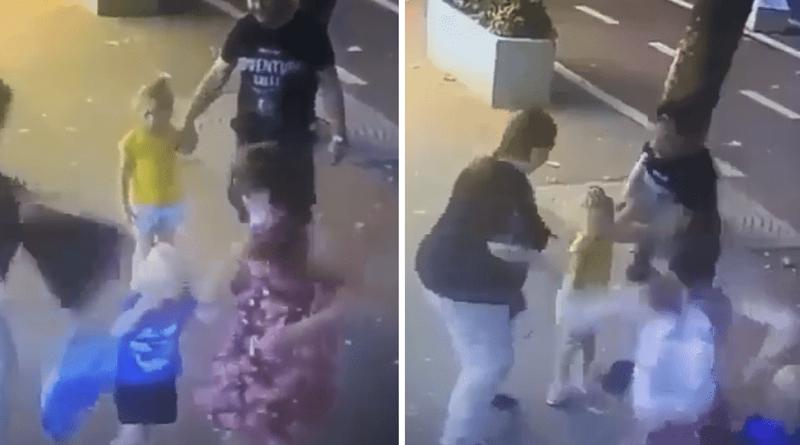 En el video se puede observar como una señora pasa por el lado de los niños y sus padres, cuando de pronto saca su cuchillo y hiere en el rostro al niño que lleva un short y un polo de color azul.