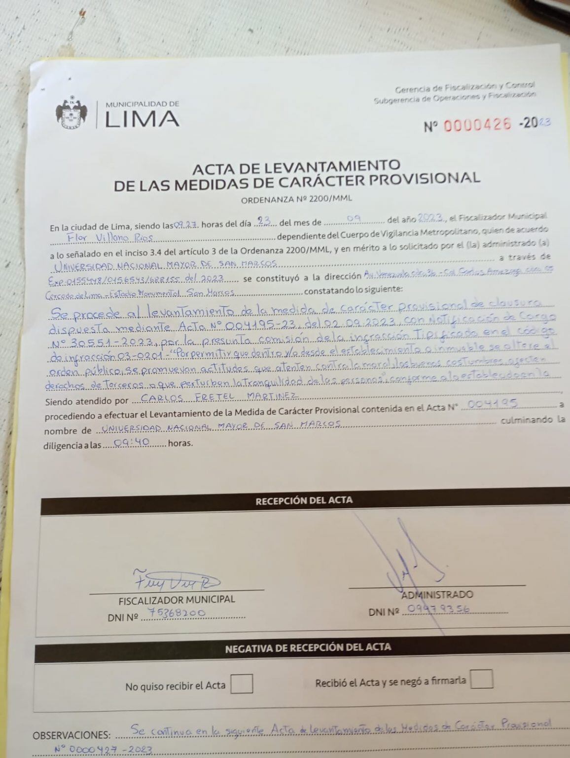 “Se procede al levantamiento de la medida de carácter provisional de clausura dispuesta mediante acta N° 004195-23 del 02 09 2023 con notificación de cargo N° 30551-2023, por la presunta comisión de la infracción tipificada en el código de infracción 03-0201″, se lee en el documento de la Gerencia de Fiscalización y Control y la Subgerencia de Operaciones y Fiscalización.
