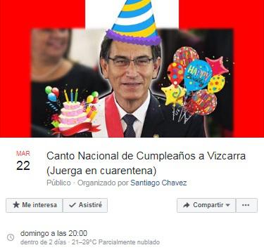 Por ello, en Facebook los peruanos han organizado un masivo evento llamado: “Canto Nacional de Cumpleaños a Vizcarra (Juerga en cuarentena)”.