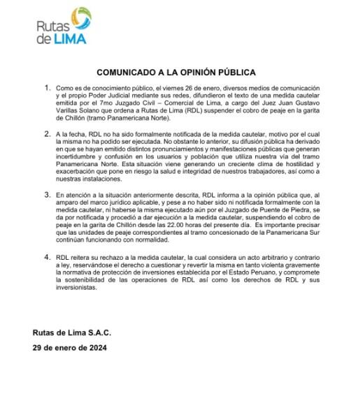 Mediante un comunicado, dicha concesionaria informó que ejecutarán la medida, pese no haber sido notificados formalmente sobre la medida cautelar emitida, el pasado viernes 27, por el Séptimo Juzgado Civil con Subespecialidad en lo Comercial de Lima.