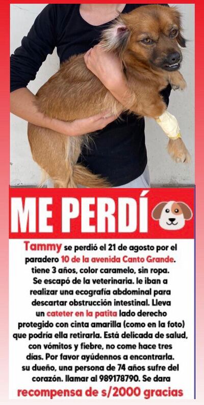 La familia de “Tammy” está ofreciendo una recompensa de S/2000 por su ubicación. Recordamos que se perdió en el paradero 10 de la avenida Canto Grande por donde están los puestos de venta de frutas, altura del semáforo. Podría haberse ido por dentro del mercado y los alrededores. Cualquier información de su paradero contactar al celular 989178790.