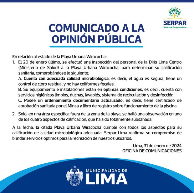 “A la fecha, la citada playa cumple con todos los aspectos para su calificación de calidad microbiológica adecuada. Serpar Lima reafirma su compromiso de brindar servicios óptimos”, indica el comunicado.