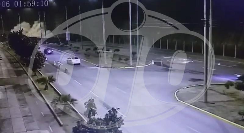 Cuando estos vehículos estaban en la otra pista, dos automóviles aparecen circulando a toda velocidad en la vía paralela. Luego, sus conductores pierden el control de los vehículos y se estrellan contra el montículo tierra, pero previo atravesaron la valla de seguridad.