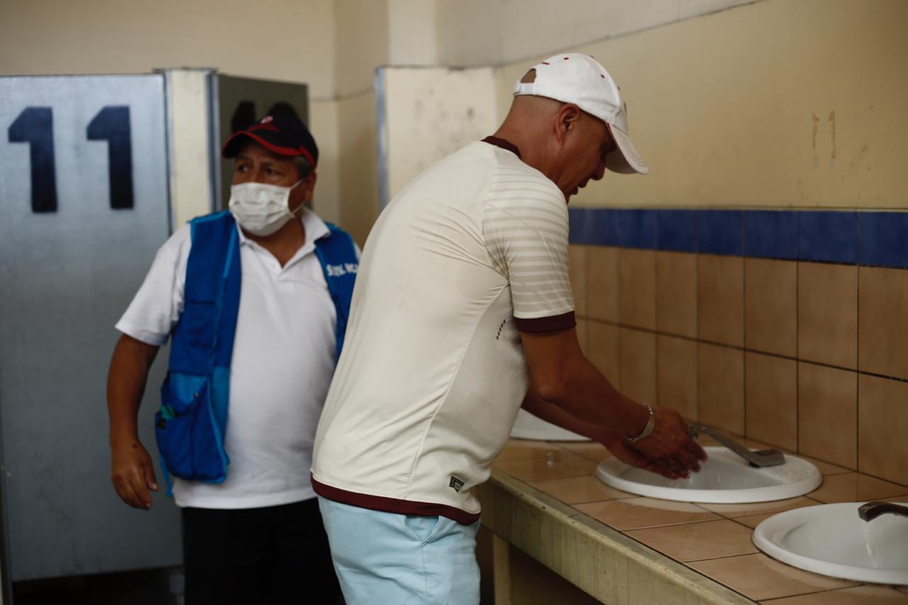 Primero que se colocó jabón líquido y gel antibacterial en los baños del coloso de Ate. Allí, los hinchas cumplen con la primera parte del protocolo de prevención. Algunos hinchas asistieron con mascarillas, pero el personal de limpieza del recinto de Universitario de Deportes siempre estuvo con mascarilla de protección.