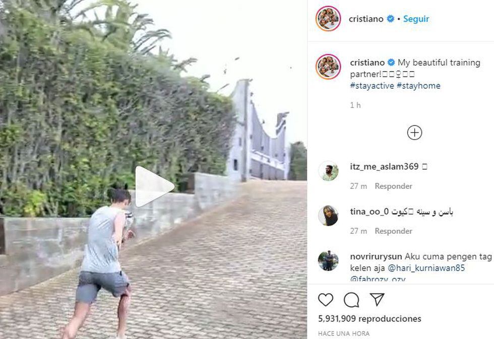 “Mi hermosa compañera de entrenamiento”, fue la leyenda que escribió Cristiano Ronaldo. En las imágenes se aprecian a ambos personajes, turnándose para subir y bajar una rampa de la casa del futbolista en Madeira, Portugal.