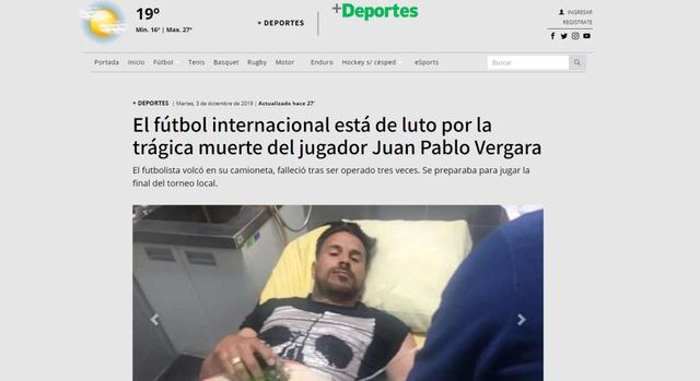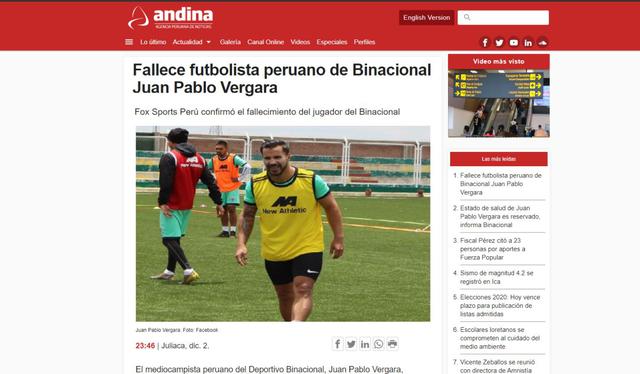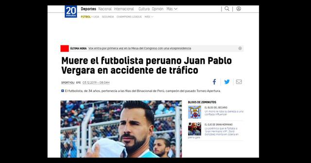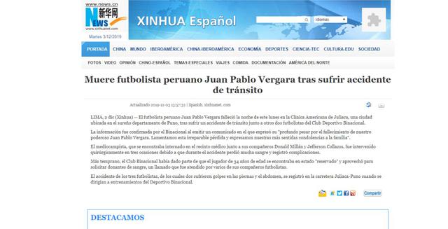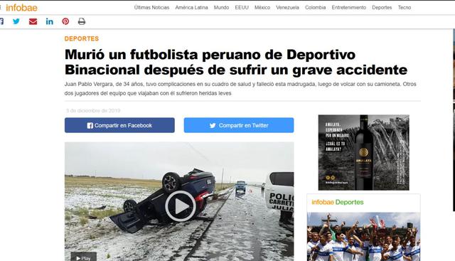 Un accidente automovilístico y unas complicaciones posteriores terminaron con la vida de Juan Pablo Vergara, jugador de 34 años que pertencía a Binacional de Juliaca, club que peleará el título nacional del fútbol peruano y jugará la Copa Libertadores 2020. Y su fallecimiento no fue ajeno a los medios internacionales.