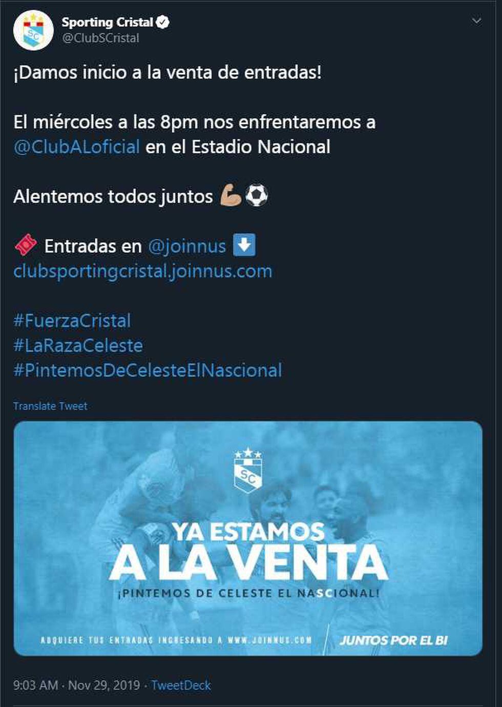 Para comprar tus entradas, debes acceder a la web de Joinnus. Ese será el único medio por el cual se expedirán las entradas para ir al Estadio Nacional y alentar al equipo del cual es hincha. Pueden comprar hasta cuatro boletos por persona.