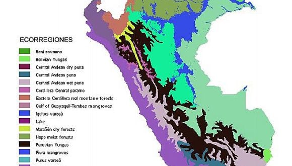 Perú tiene 11 ecorregiones o biorregiones y estas son: mar frío, mar tropical, desierto del Pacífico, bosque seco ecuatorial, bosque tropical del Pacífico, serranía esteparia, páramo, puna, selva baja, selva alta y sabanas palmeras.