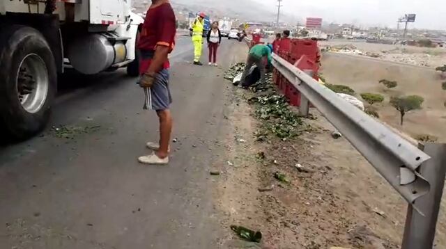 De acuerdo a las imágenes difundidas en vivo, cientos de botellas de vidrio quedaron destruidas al lado de la vía. La carga del camión iba a ser enviada a la ciudad de Chiclayo.