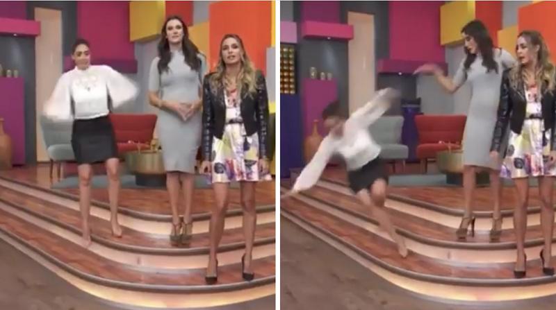 Como se puede ver en las imágenes difundidas en redes, la conductora terminó cayendo al piso cuando miraba a la cámara, junto a otras dos compañeras.