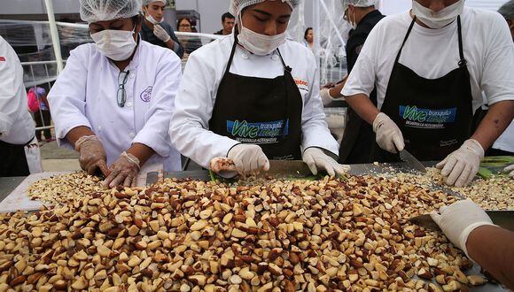 A los maestros de la Asociación de Productores y Empresarios Pasteleros de Perú les tomó unas ocho horas trabajar con más de una tonelada de cacao para elaborar la barra, de siete metros de largo por tres de ancho, en la que también incluyeron más de 20 kilos de castañas y nueces de la variedad pecana.