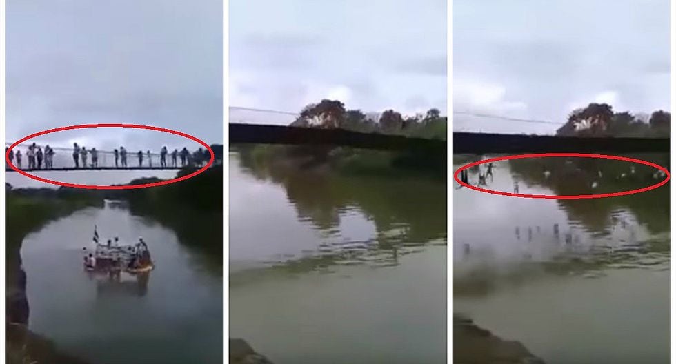 En el video se observa el paso de las balsas hasta que, de pronto, suena un estruendo y la estructura del puente se voltea y termina con las personas, entre ellos niños, en las aguas. Las personas que estaban en la orilla del río corren a auxiliar a las víctimas.