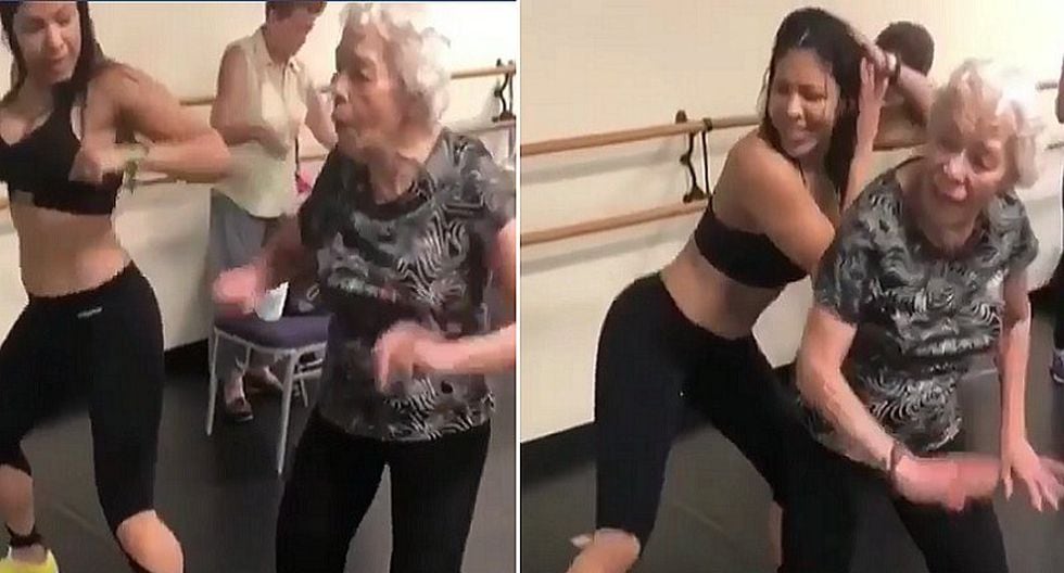 Pese a su aparente avanzada edad, la abuelita se mueve con mucho ritmo y logra seguir sin ningún problema a la instructora, quien hace actuales pasos de baile.