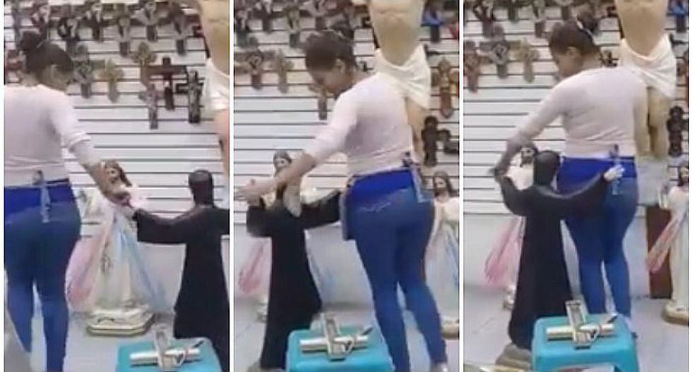 En medio de una tienda de artículos religiosos, una cámara captó a una mujer bailando con San Charbel a ritmo de cumbia.