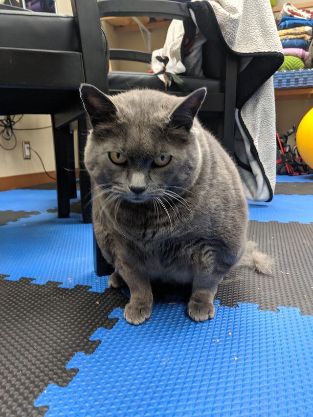 La gata padece obesidad mórbida y pesa 11 kilos, por lo que ha sido inscrita en un programa de reducción de peso. Sin embargo, el felino no parece tomar en serio los ejercicios y, en la cinta de correr, solo usa una pata para completar la actividad, mientras maulla (a modo de queja).