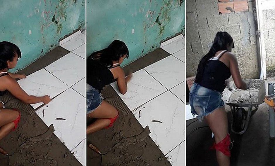 En las imágenes se puede ver a la mujer colocar la mezcla de cemento sobre el suelo, emparejar y luego colocar el porcelanato para dar pequeños golpes con la mano.