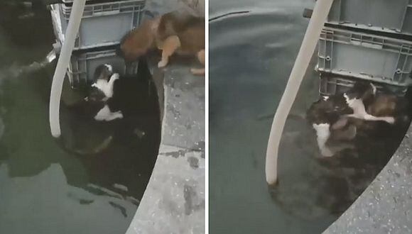 Como se puede ver en las imágenes registradas y compartidas en , el can se acercó y el gatito trató de salvarse pero el minino solo hizo que los dos cayeran al pozo.