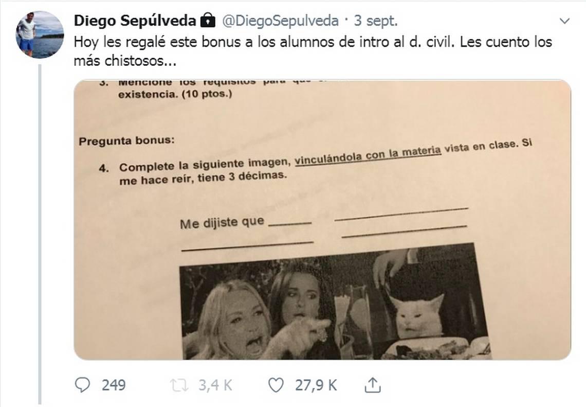 El profesor compartió la imagen contando lo sucedido."Hoy les regalé este bonus a los alumnos de Intro al D. Civil. Les cuento los más chistosos", escribió.