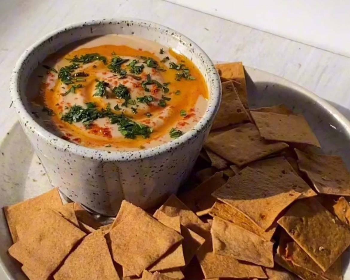 Licúa todos los ingredientes hasta que esté cremoso. Vierte en un pote pequeño y decora con pimentón en polvo, perejil picado y aceite de oliva.