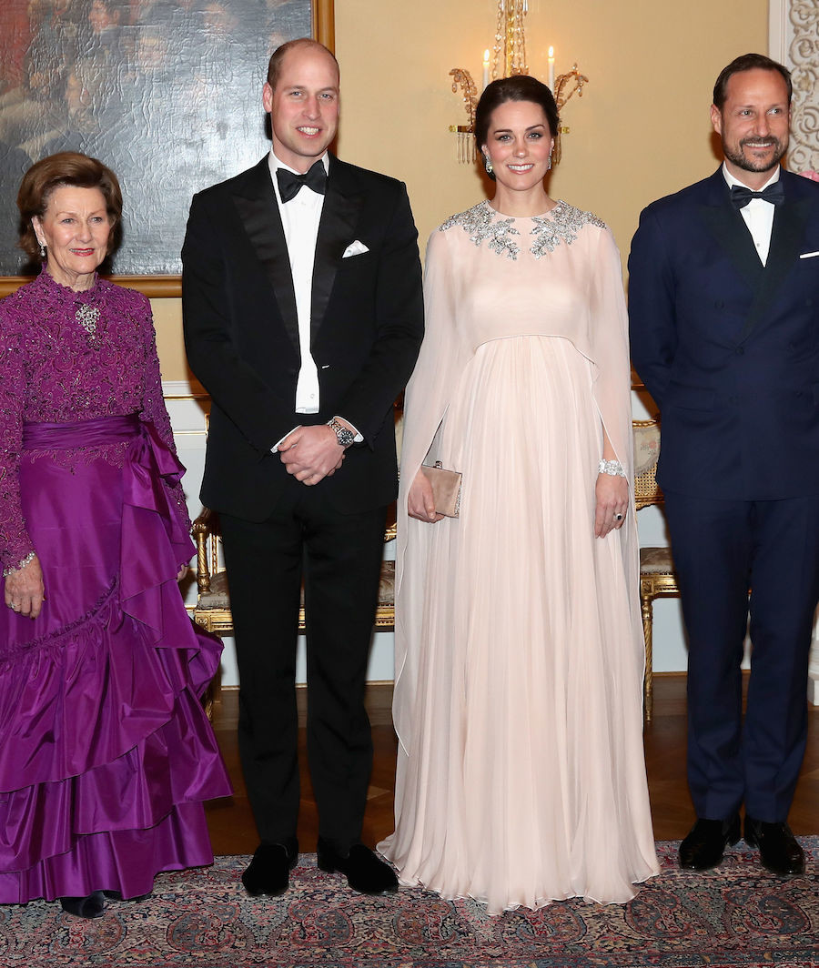 Kate Middleton, la Duquesa de Cambridge, dejó a todos boquiabiertos debido al vestido palo rosa, firmado por Alexander McQueen, el cual usó durante la gala ofrecida en su honor con motivo de su visita para conocer a los Reyes de Suecia. El vestido llevó una serie de abalorios en el cuello y una sutil capa sobre los hombros que la protegió del frío así como un clutch en terciopelo rosa y joyas plateadas.