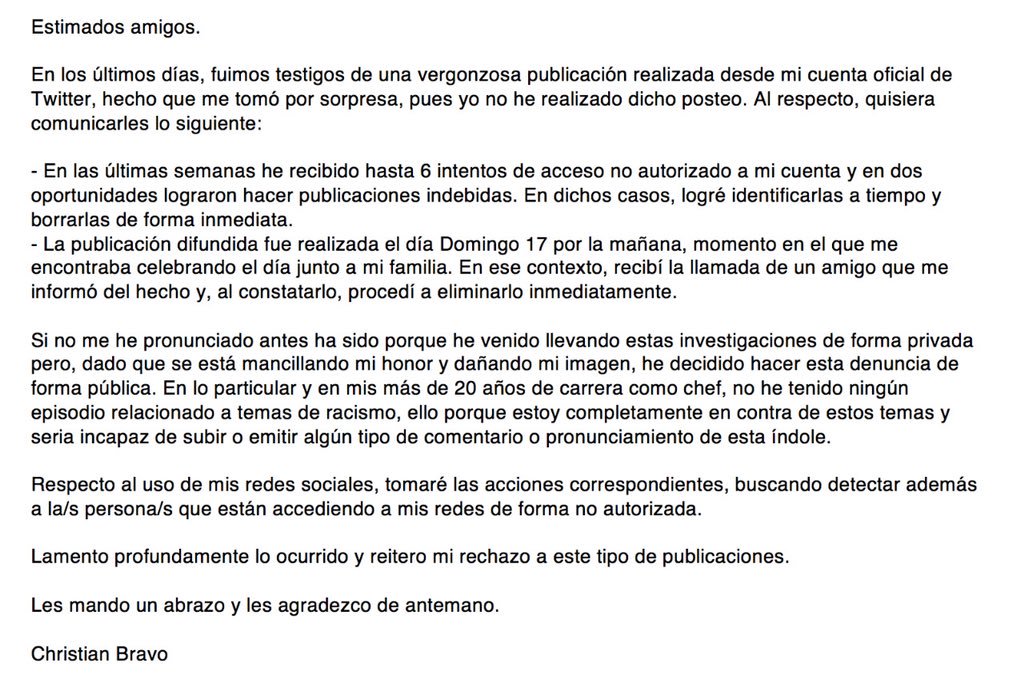 En Twitter, muchos se han sentido indignados con una reciente publicación del reconocido chef peruano, Christian Bravo. El famoso ex conductor de 'Ayer y Hoy' se manifestó al respecto en una misiva que dejó en su misma cuenta en respuesta a sus seguidores.