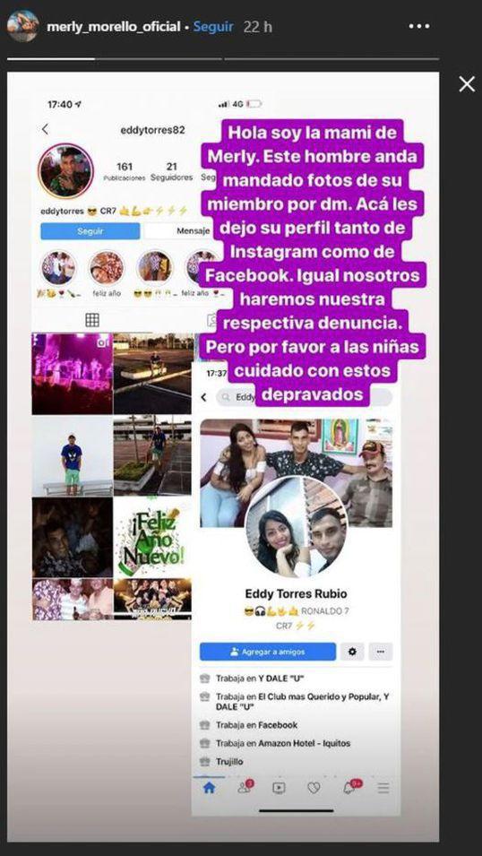 “Hola soy la mami de Merly. Este hombre anda mandado fotos de su miembro por dm (mensaje privado). Acá les dejo su perfil, tanto de Instagram como de Facebook”, manifestó.