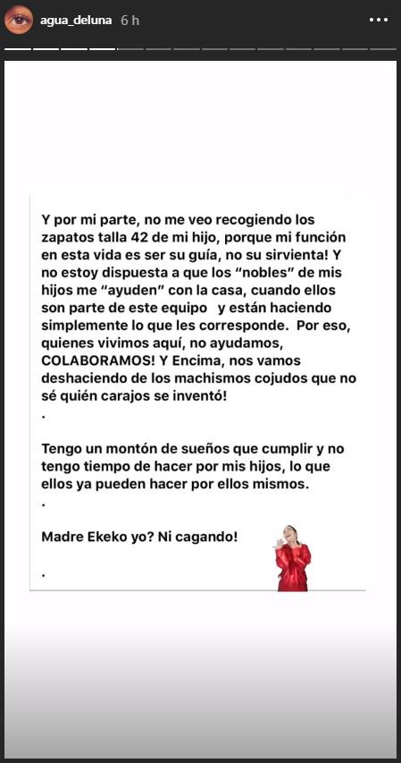 “No me veo recogiendo los zapatos talla 42 de mi hijo, porque mi función en esta vida es ser su guía, no su sirvienta”, añadió en medio de un extenso mensaje.