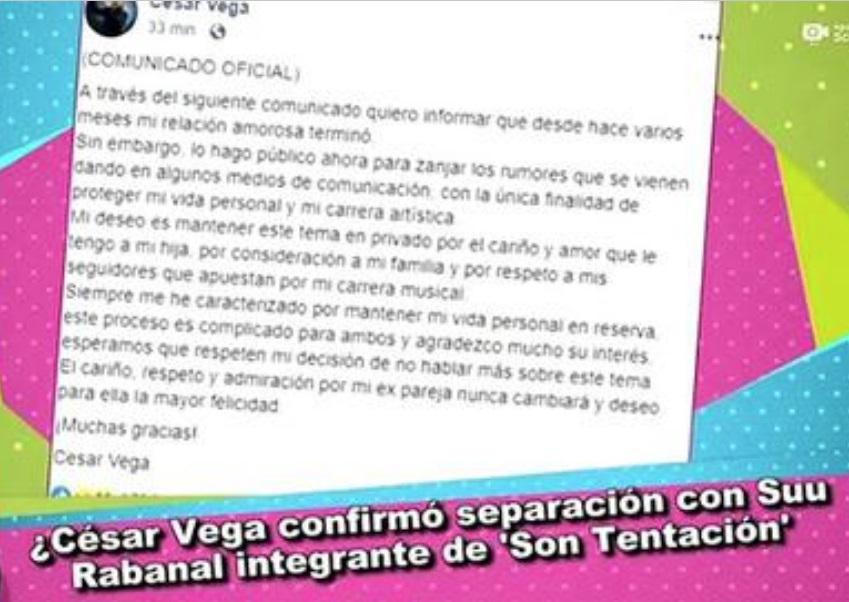 Una de las separaciones que más sorprendió fue la que anunciaron el salsero César Vega y la tentación Suu Rabanal. Fue el sonerito quien contó que estaba separado de la mamá de su niña.