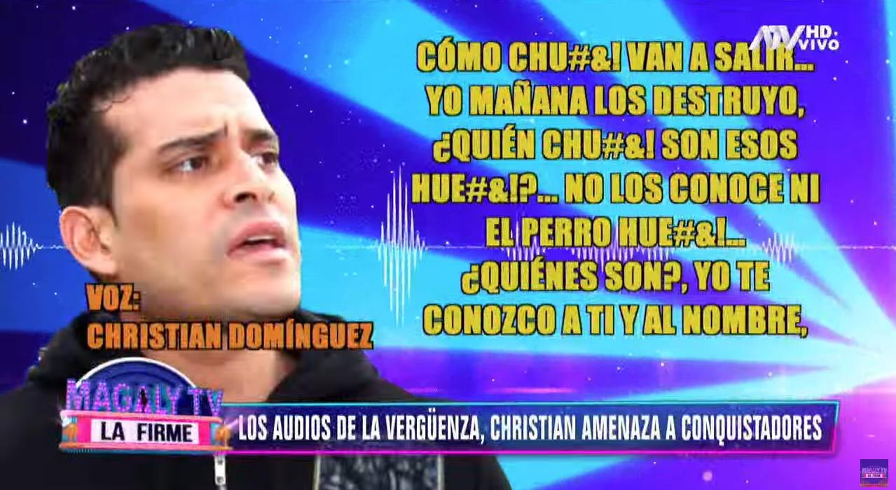 “Yo no sé quien ch... son tus cantantes hu... pero yo no soy ningún hu...Yo veo pu... yo voy a averiguarme quiénes son para partirlos hu... a mi me llega. A mi me llega...hu...Yo no me meto con nadie para que nadie se meta conmigo. Tú sabes que no soy ni un hu... y que tampoco soy tranquilo...”, es parte de lo que dijo Christian Domínguez al líder de “Los conquistadores de la salsa”.