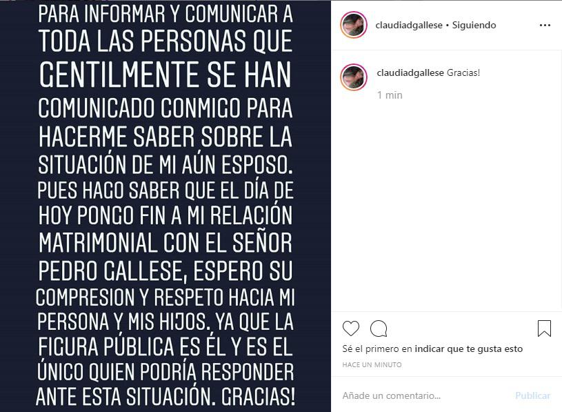 “Para informar y comunicar a todas las personas que gentilmente se han comunicado conmigo para hacerme saber sobre la situación de mi aún esposo. Pues hago sabes que el día de hoy pongo fin a mi relación matrimonial con el señor Pedro Gallese, espero su comprensión y respeto hacia mi persona y mis hijos, ya que la figura pública es él y es el único quien podrá responder ante esta situación. Gracias!”, escribió.