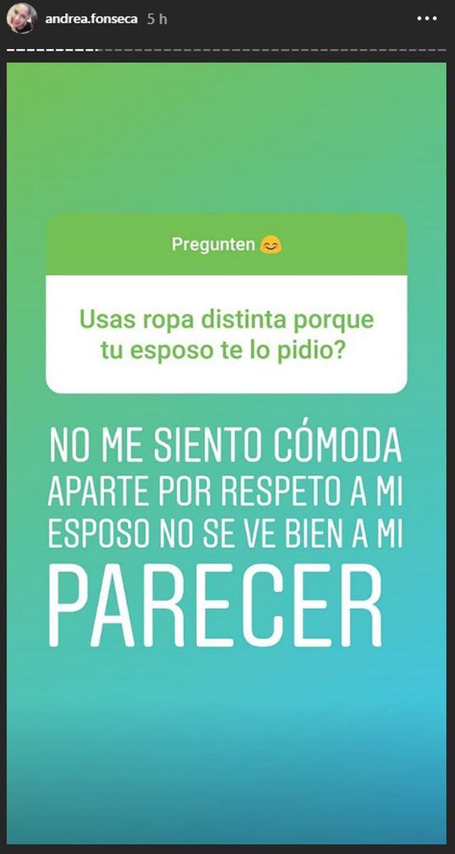 “¿Usas ropa distinta porque tu esposo te lo pidió?”, preguntaron y Andrea Fonseca respondió: “no me siento cómoda aparte por respeto a mi esposo no se ve bien a mi parecer”.